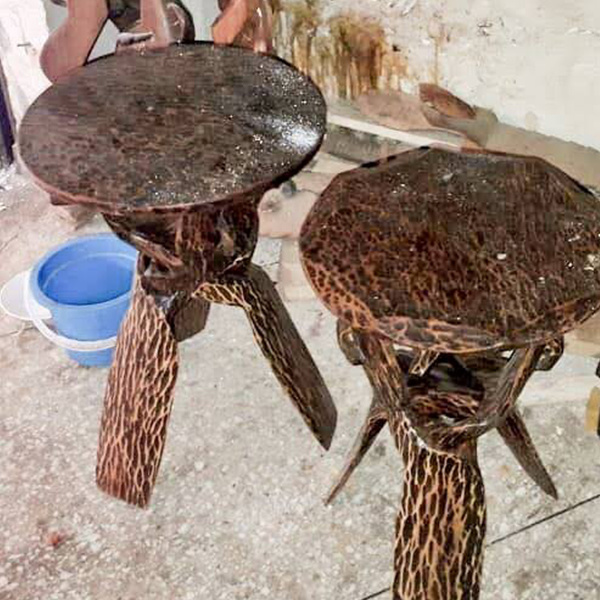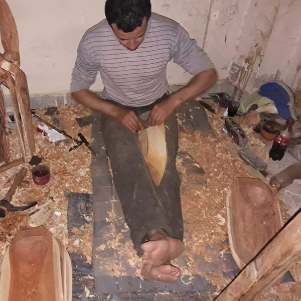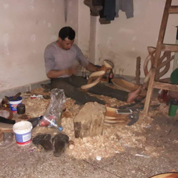 モロッコアトラス山脈原産のマツ科の樹木シダーウッドを使いテーブル、ボール、etc,全ての工程を手で創りあげるwood artisan。シダーウッド特有の味わいに誘われて赴き目にした手仕事に一目惚れしオーダー開始。今日の日も地に腰下ろし黙々とシダーウッドを削り製品を製作中。